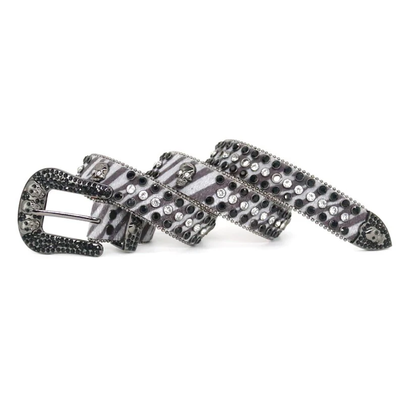 The Skull Trio Rhinestone Zebra Belt brings together bold design and striking detail. Featuring a zebra-patterned strap layered with diamond-like rhinestones, this mens skull belt stands out with its unique mix of textures. The buckle showcases three small skulls, adding an extra edge to this stylish piece. A must-have for anyone who loves a little wild with their sparkle.